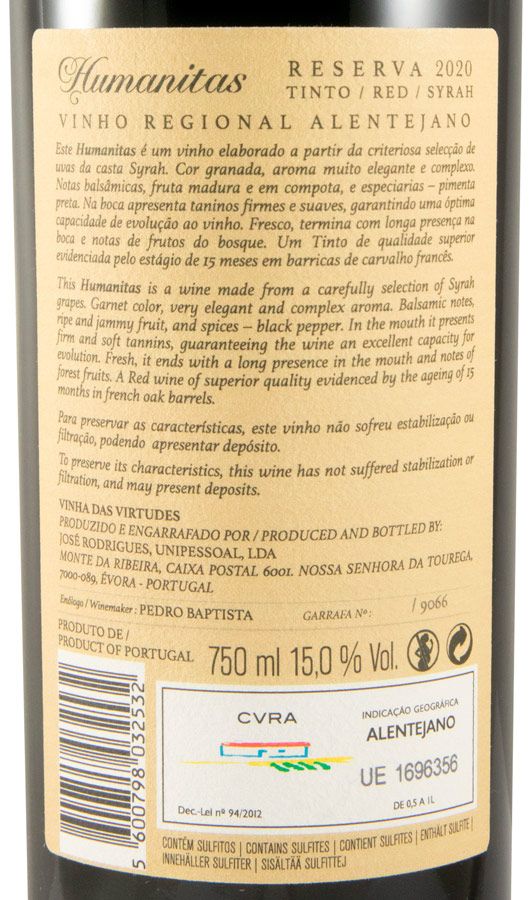 Com uma cor granada profunda, o Humanitas Syrah Reserva tinto revela um aroma elegante e complexo, onde se destacam notas balsâmicas, fruta madura em compota e especiarias, como pimenta preta. A vinificação em pequenos lagares de aço inox, com pigeage manual e a fermentação maloláctica, seguido de um estágio de 15 meses em barricas de carvalho francês, conferem ao vinho uma estrutura notável. No paladar, apresenta taninos firmes e suaves, garantindo uma excelente capacidade de evolução. Fresco e envolvente, termina com uma longa presença, realçada por notas de frutos do bosque.