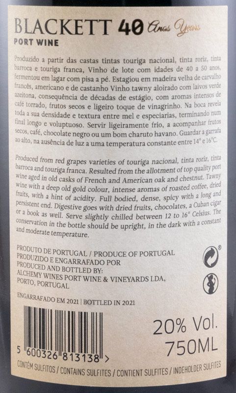 O Blackett Tawny 40 Anos apresenta uma cor aloirada com nuances esverdeadas. O aroma é intenso e complexo com frutos secos, café, especiarias e algumas notas de fumo. Na boca é um Porto poderoso e encorpado, com um final muito persistente.